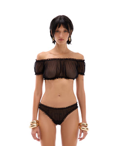 Stringi wykonane z najwyższej jakości, miękkiej siateczki, ozdobione delikatnym marszczeniem na elastycznej gumce. Dzięki temu subtelnemu detalowi model zyskuje wyjątkowy, kobiecy charakter i dopasowuje się do sylwetki, zachowując pełen komfort noszenia.
