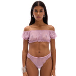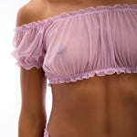 Top w stylu hiszpanki wykonany z najwyższej jakości, miękkiej siateczki, która jest przyjemna w dotyku i lekka w noszeniu. Delikatne marszczenie na elastycznej gumce dodaje całości subtelności i podkreśla kobiecy charakter modelu.